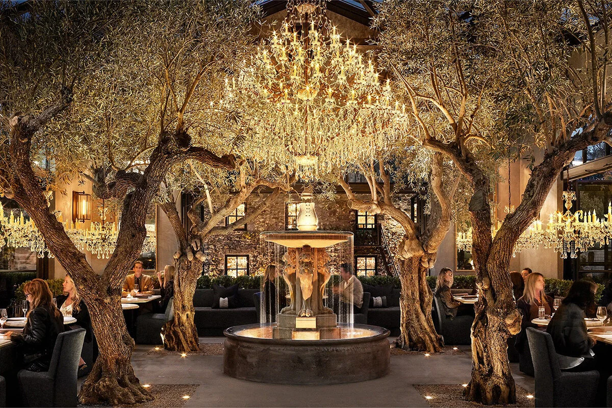 Once established, the Sculpted Sevillano Olive Tree requires very little water and can grow even indoors. It can be planted in a variety of landscapes (including indoors) due to its tolerance of poor, rocky, or shallow soil. Its unique multi-trunk structure and colorful foliage, make this olive tree the perfect focal point for any interior or exterior landscape design. Our Sculpted Sevillano Olive Trees have been planted in a variety of indoor and outdoor landscape designs, including Restoration Hardware in Yountville, California located in the beautiful Napa Valley. the interior of high end hotel atrium lobbies.